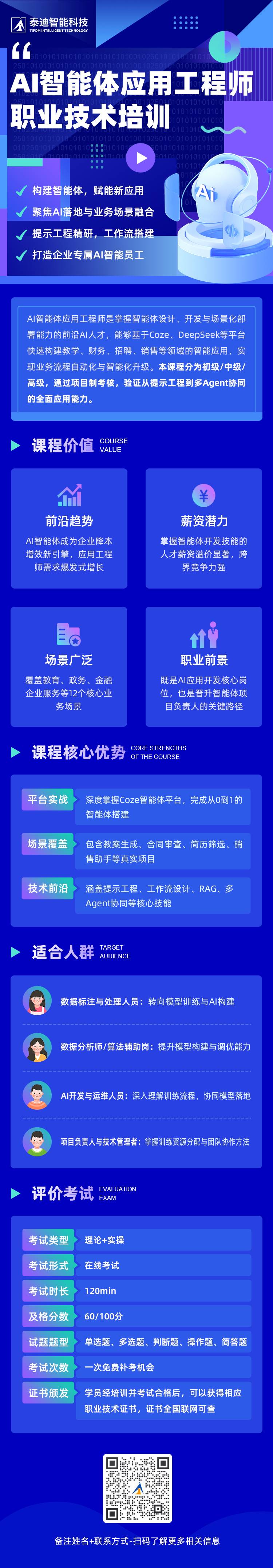 AI智能体应用工程师是掌握智能体设计、开发与场景化部署能力的前沿AI人才,能够基于Coze、Deepseek等平台快速构建教学、财务、招聘、销售等领域的智能应用,实现业务流程自动化与智能化升级。本课程分为初级/中级/高级,通过项目制考核,验证从提示工程到多Agent协同的全面应用能力。