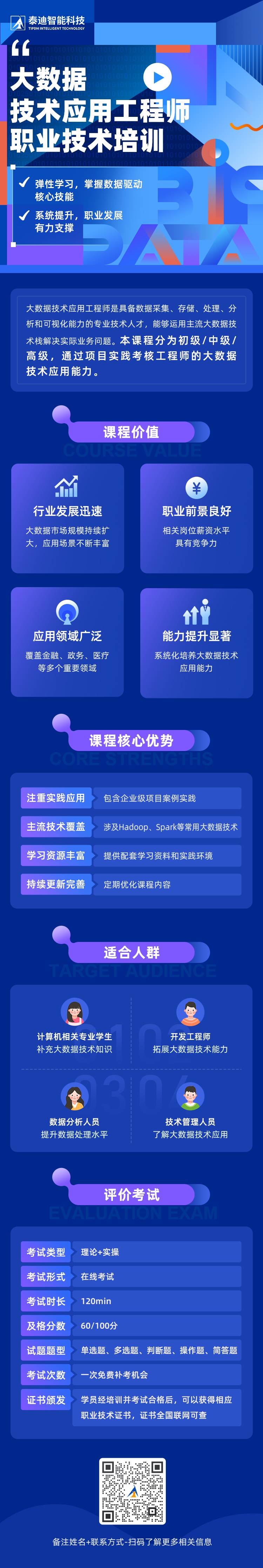 “大数据技术应用工程师 ”是对在数据分析、机器学习、深度学习、人工智能领域中使用大数据据技术作为主要方法从业者的全面考核,分为初级,中级,高级三个等级。