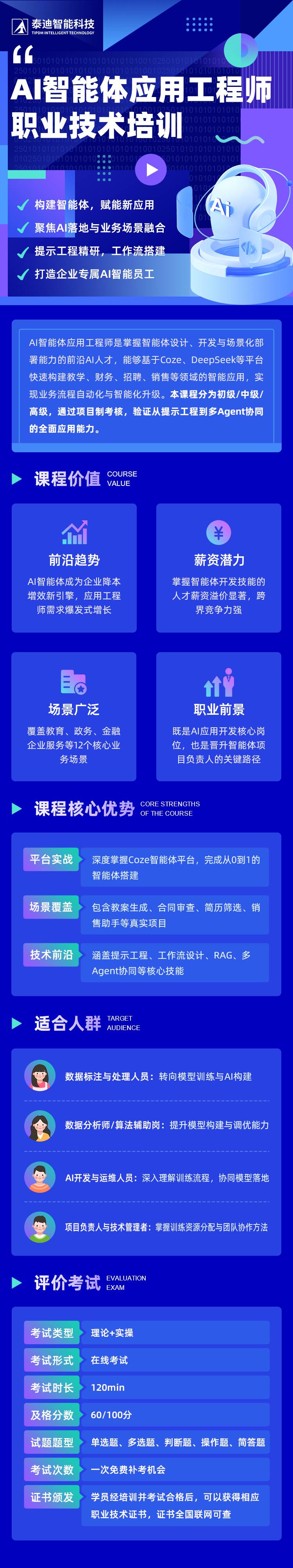 AI智能体应用工程师是掌握智能体设计、开发与场景化部署能力的前沿AI人才,能够基于Coze、DeepSeek等平台快速构建教学、财务、招聘、销售等领域的智能应用,实现业务流程自动化与智能化升级。本课程分为初级/中级/高级,通过项目制考核,验证从提示工程到多Agent协同的全面应用能力。